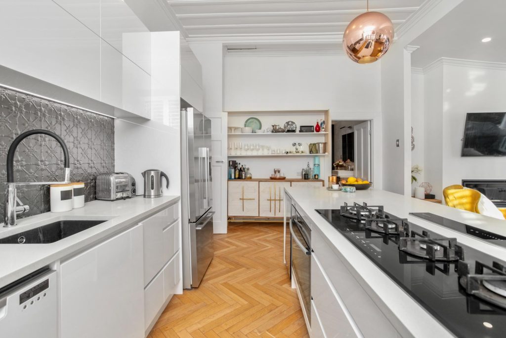 - A clean, elegant kitchen with a large island and pressed steel splashback
