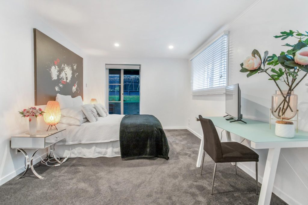 The two-bedroom area downstairs, which included a separate living/dining space and kitchenette, was given a modern makeover to match the new elegance of the upstairs renovation.